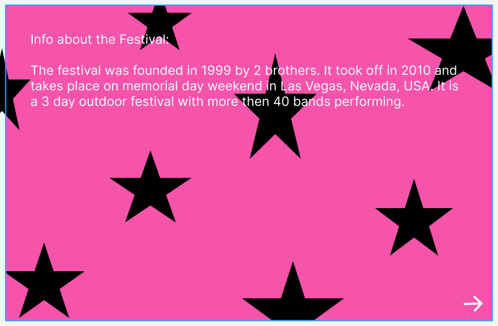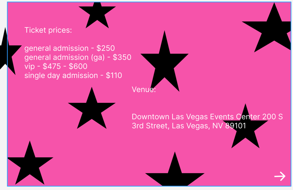 For the next page I added ticket prices and the venue. Again, I didn’t change the sizing of anything or the font. I kept everything the same colour and added nothing else to the background. I still had no thoughts on how to progress with my website so I struggled to make it this far and had no thoughts on how to design it or what I wanted the layout to be, so I just placed text anywhere it would fit on the page.