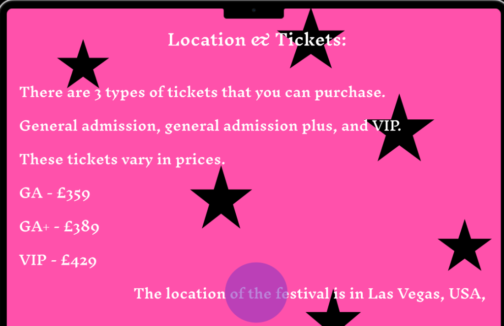 This was one of my rejected designs. I didn’t end up using this because the location of the festival went through the button at the bottom of the page. The ticket prices are also wrong and I didn’t clarify the meanings behind the tickets.
