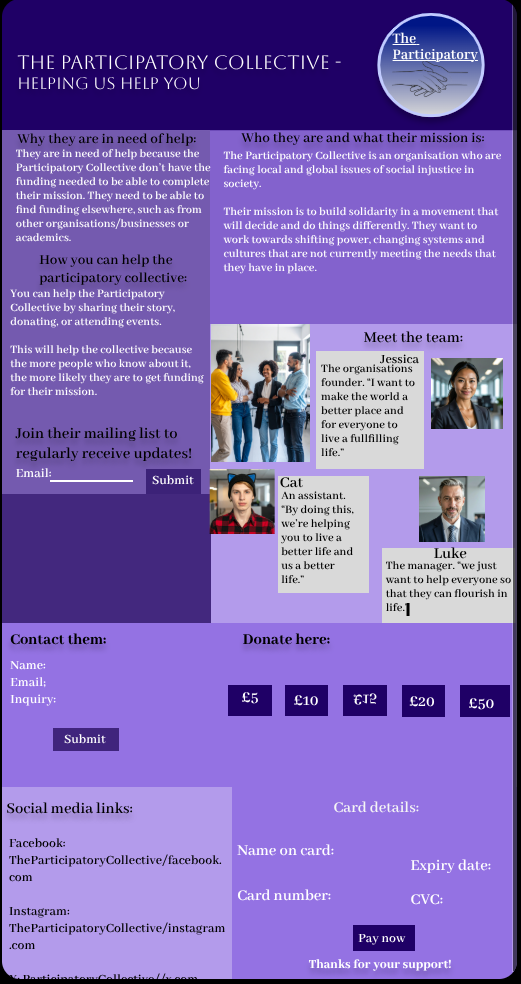 This is the logo that I designed for the participatory collective. As the participatory collective is about wanting to help people and being able to let everyone live fullfilling lives, I decided to add two hands in the middle of the logo, reaching out to each other and holding on, like one person is pulling another person away from an unfair society and allowing them to join them in a happier life.
